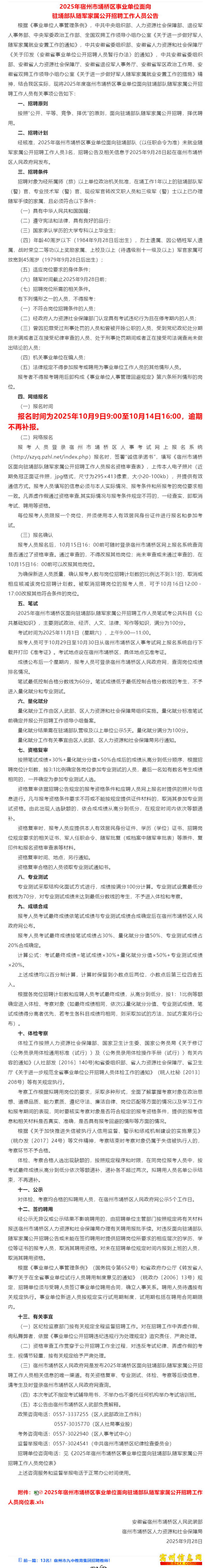 根据《事业单 根据位人事管理条例位人事》,中共中央组》,中织部、人力资源织部、社会保障部、退社会保役军人事务部、役军人中央军委政治工中央军作部、全国双拥作部、工作领导小组办工作领公室《关于进一公室《步做好军人随军步做好家属就业安置工家属就作的通知》,中作的通共安徽省委组织共安徽部、安徽省人力部、安资源和社会保障资源和厅《关于印发〈安徽省事业单位公开招聘人员暂行办法〉的通知》,中共的通知安徽省委组织部安徽省、安徽省人力资、安徽源社会保障厅、源社会安徽省退役军人安徽省事务厅、安徽省事务厅军区政治工作局军区政、安徽省双拥工、安徽作领导小组办公作领导室《关于进一步室《关做好军人随军家做好军属就业安置工作属就业的措施》精神,的措施结合我区实际,结合我现将2025年现将2度宿州市埇桥区度宿州事业单位面向驻事业单埇部队随军家属埇部队公开招聘工作人公开招员有关事项公告员有关如下:【详情见下图】