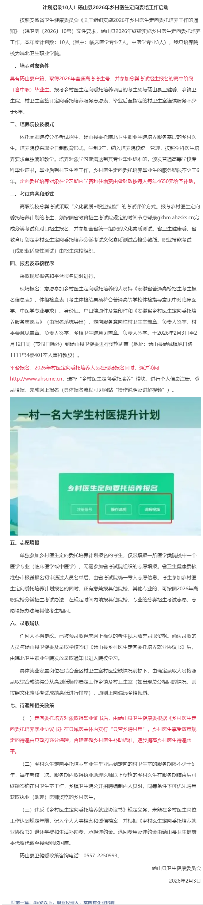 针对高中阶段毕业生,计招录10人,宿州管辖县乡村医生定向委培