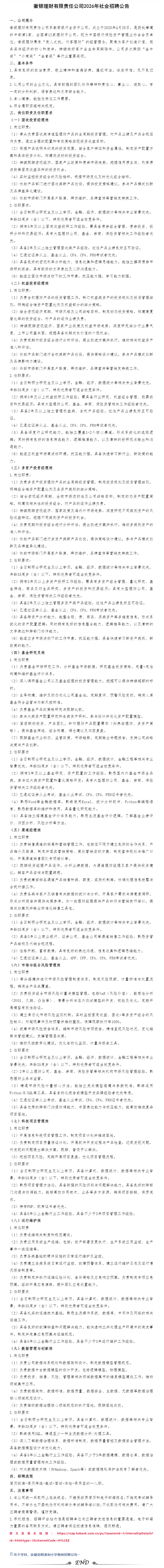 徽银理财有限责任公司2026年社会招聘公告~