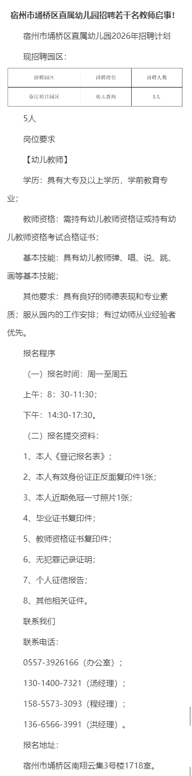 宿州市埇桥区直属幼儿园面向社会招聘教师